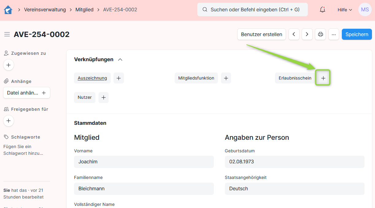 Mitglied aus der Mitgliederliste auswählen und auf das „+“ neben Erlaubnisschein klicken: