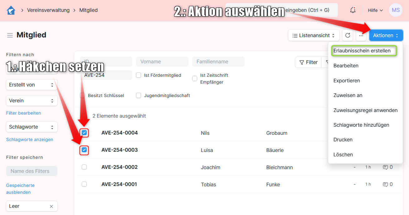 Ein oder mehrere Mitglieder auswählen (blaue Häkchen setzen) und über „Aktionen“ Menüpunkt „Erlaubnisschein erstellen“ auswählen:
