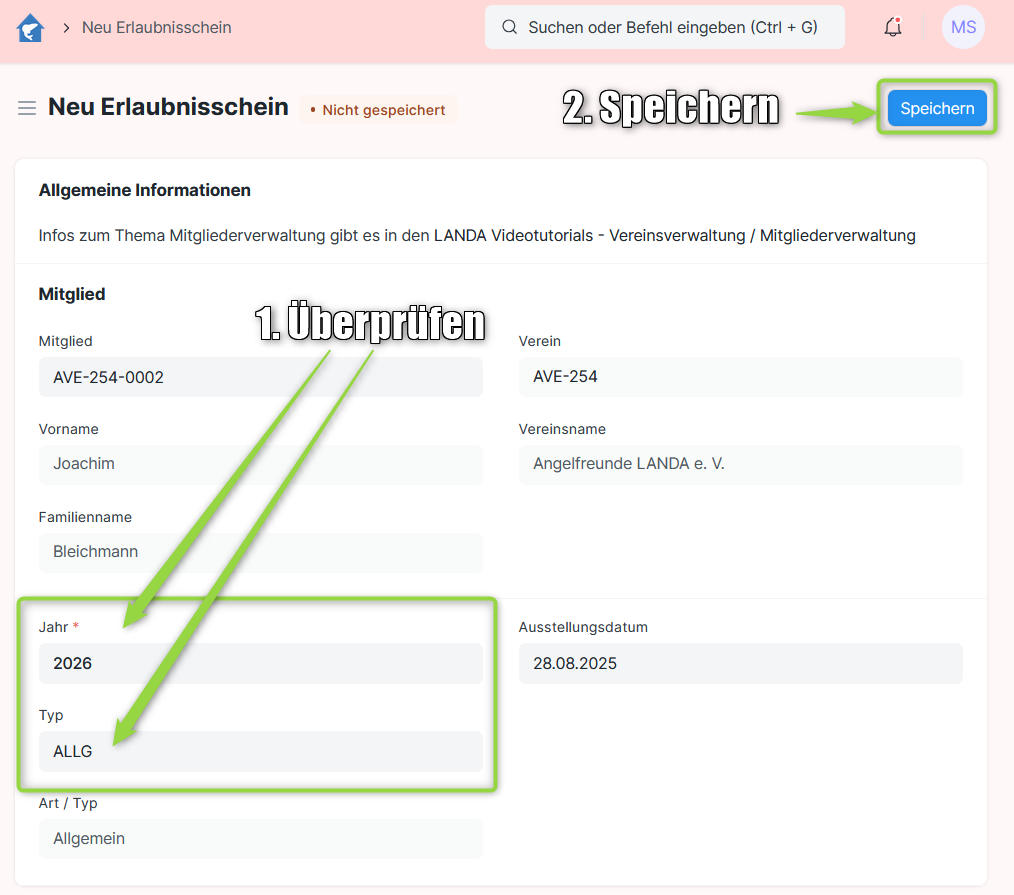 >> Neumitglieder müssen erst in LANDA erstellt werden, damit die Mitgliedsnummer bekannt ist und somit die Erlaubnisscheinnummer generiert werden kann.